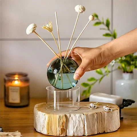 Cet ensemble harmonieux ajoute une couleur subtile qui capte le regard sans surcharger votre espace. Imaginez une table dressée, décorée de ce soliflore sphérique sur socle avec des plantes vertes pour une note de fraîcheur.