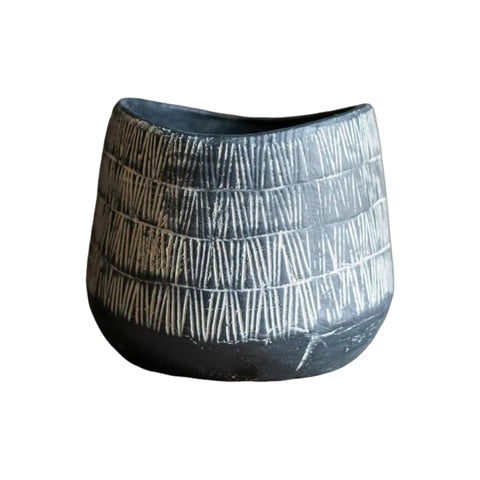 Ce vase en céramique, façonné à la main avec des lignes blanches striées, évoque des époques révolues. Adapté aux décors vintage ou moderne, il est disponible en trois tailles : 10, 17 et 31 cm de haut.