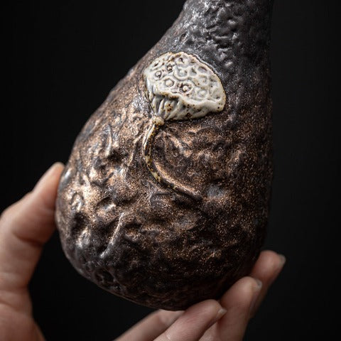 Sa forme délicatement travaillée transporte votre espace dans une ambiance rétro. Sur le devant du vase, on découvre une glaçure en fer motif fleur de lotus, une petite touche florale et subtile à la fois.