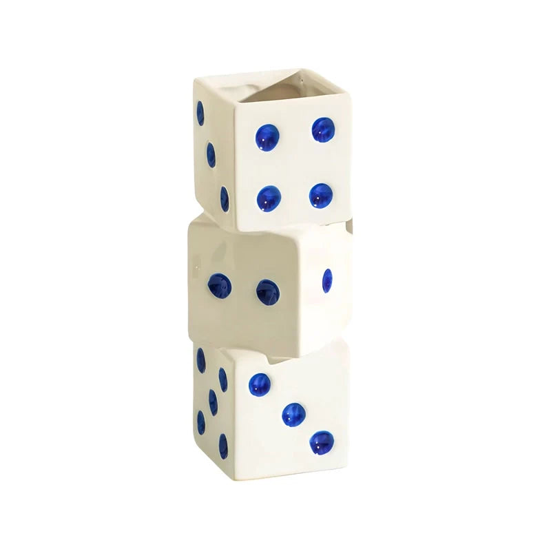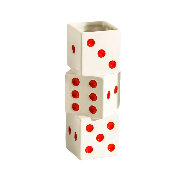 Donnez du relief à votre décoration grâce à ce vase créatif de 24 cm de haut. Sa structure composée de trois cubes empilés en quinconce évoque les dés d’un jeu. Sa finition mate est sublimée par des points rouges, noirs ou bleus qui contrastent subtilement avec la céramique blanche.