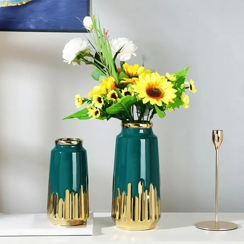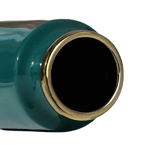 Chaque détail doré contraste avec les teintes du vert profond ou du blanc pur, pour un design distingué et sophistiqué. Attardez-vous quelques instants sur son col plaqué or et son motif qui ressemblent à de magnifiques stalagmites dorées. Sa finition brillante et ses dorures rehaussent l’allure majestueuse de ce vase.