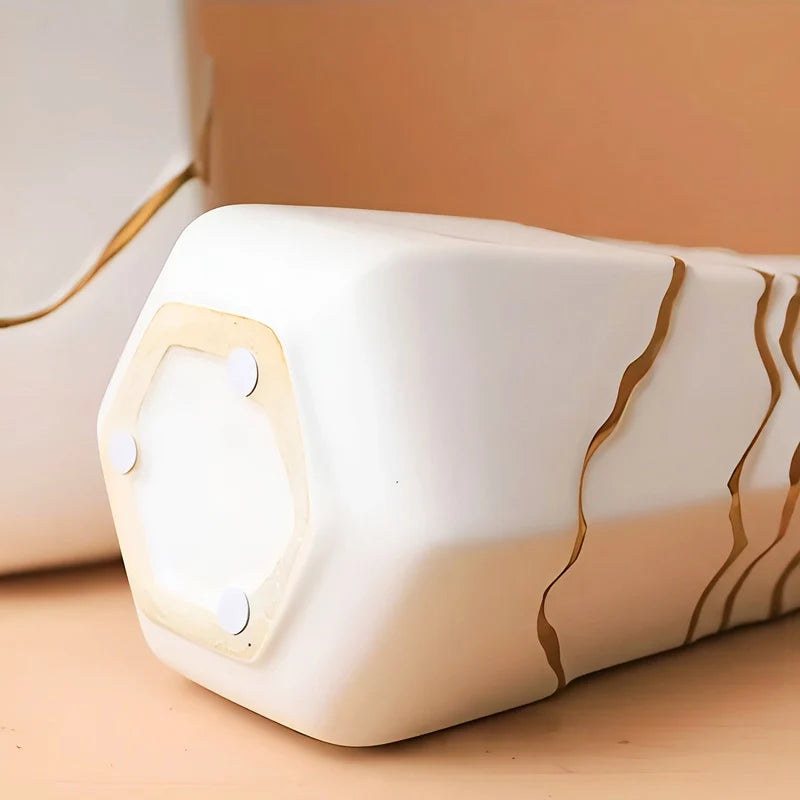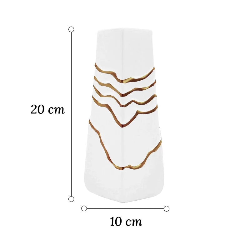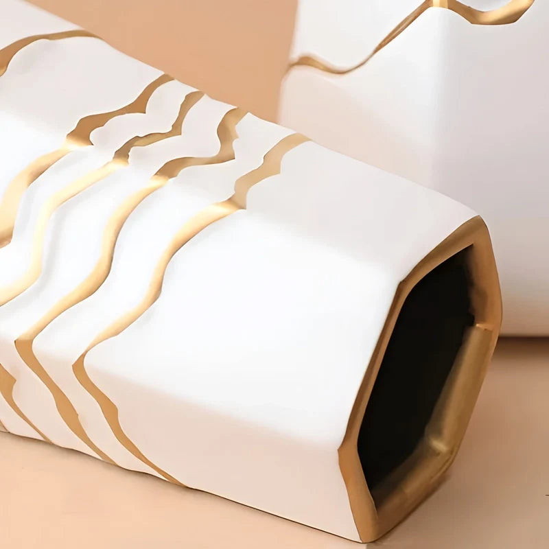 Ce vase de forme géométrique associe harmonieusement des lignes abstraites à une finition luxueuse. Le contraste délicat entre la céramique blanc brillant et le haut doré attire le regard et crée un halo de lumière dans votre pièce.